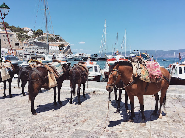 are the only motor vehicles on the island. At Hydra Port, we can see donkeys are